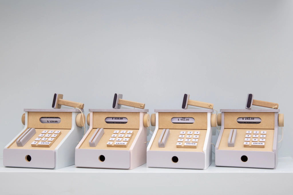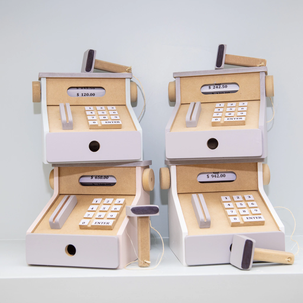 Incluye: Caja registradora + tarjeta de credito de madera. 18cm x 22cm x 17cm